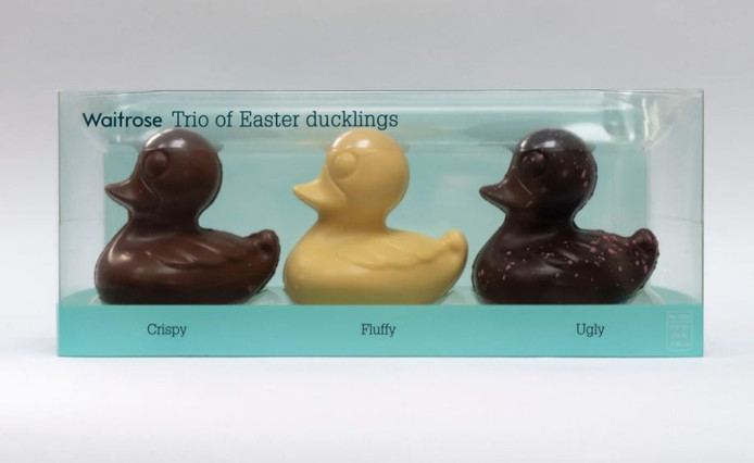 Een Britse chocoladefabrikant heeft excuses aangeboden en drie chocolade-eendjes van de markt gehaald omdat die als racistisch werden gezien. De drie paaseendjes kregen van de fabrikant Waitrose ieder een naam mee. Ongelukkigerwijs noemde de firma het donkerste eendje van pure chocolade ‘lelijk’.