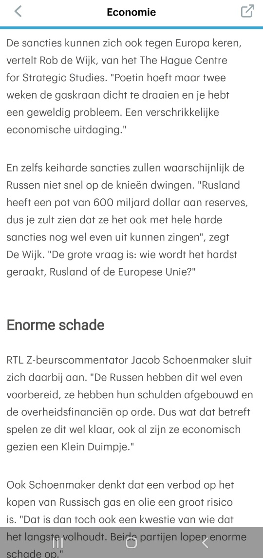 Volgens hem bestaat de kans dat er na verloop van tijd een burgeroorlog uitbreekt in Rusland. Nu de burgers geen geld meer kunnen pinnen en niet meer digitaal kunnen betalen zal over een week of 2 à 3 een groot deel van de bevolking zonder geld zitten en dus zonder eten. De bevolking zal zich niet direct keren tegen het regime maar tegen de rijken. Want daar valt geld te halen om eten te kunnen kopen. Een groot deel van de bevolking weet niet exact wat er zich afspeelt in Oekraïne en wordt keihard voorgelogen door de staatsmedia. Die geven het westen de schuld want die hebben sommige Russische banken afgesloten van SWIFT. Ik wil niet beweren dat dit een slechte zet is geweest, ik wil alleen aangeven dat volgens Sauer dit hele grote consequenties kan hebben.
