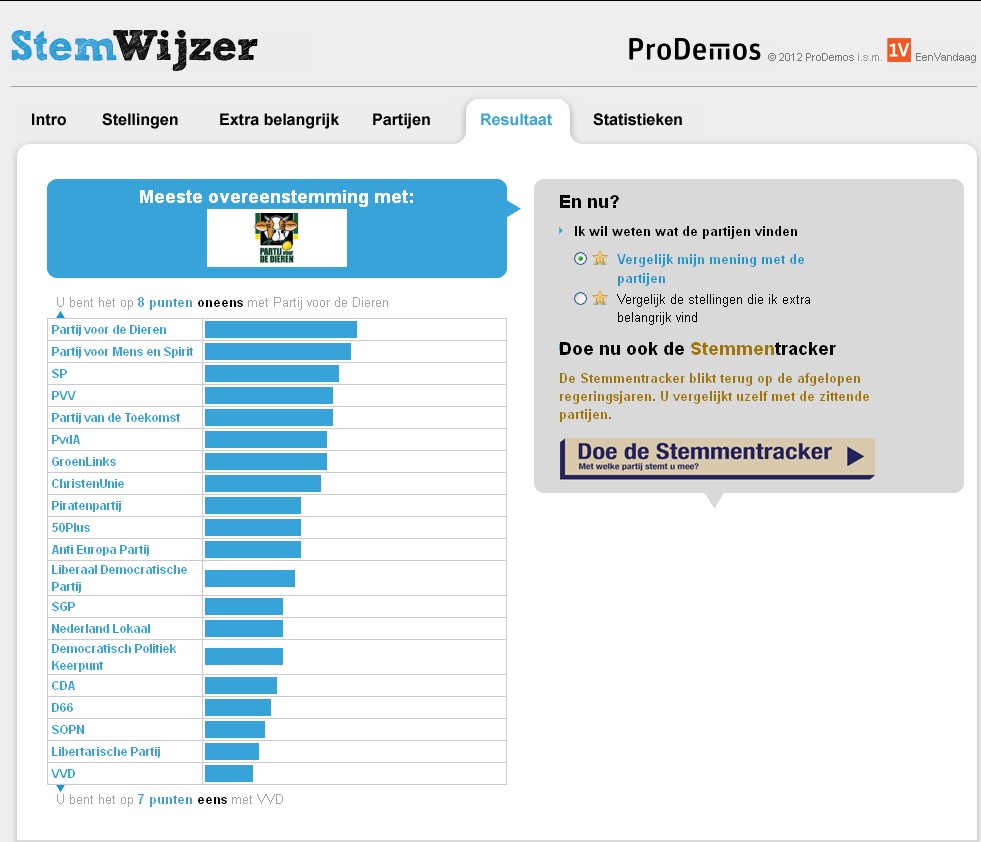 Bij mij komt groen-links bovenaan en SGP en VVD onderaan. En partij voor de dieren als 2e
