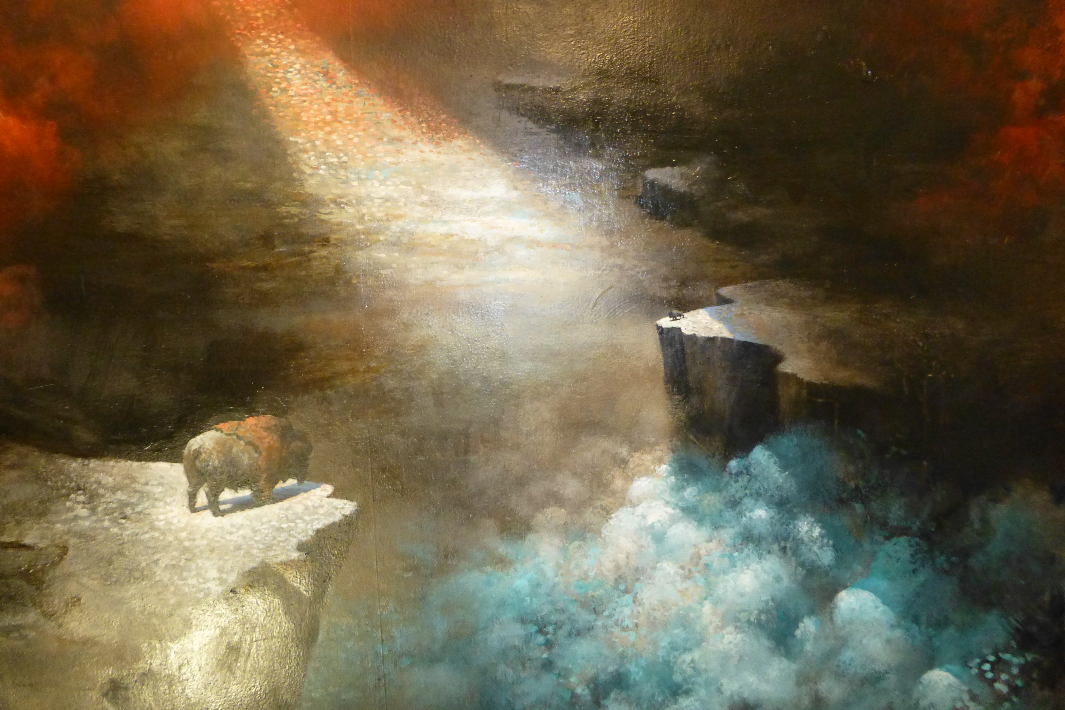 Een schilderij met dubbele dramatiek. Een natuur die, hoewel bijzonder imposant, weinig kans op leven lijkt te schenken, terwijl daarbinnenin zich nog een levensdrama afspeelt: een bizon, met zijn 900 kilo symbool voor enorme kracht, staat voor een afgrond; als je goed kijkt zul je de reden voor het levensdrama opmerken: er is heel ver weg nog een andere bizon op te merken, maar tussen de twee bizons is een kloof die onmogelijk te overbruggen schijnt (klik erop om het beter te kunnen zien):