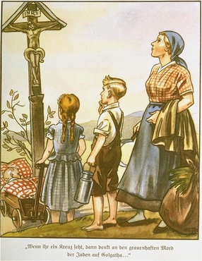 Bladzijde uit het Duitse antisemitische kinderboek ‘Der Giftpilz’, met daaronder de tekst: ‘Als je een kruis ziet, denk dan aan de verschrikkelijke moord die de joden pleegden op Golgotha.’