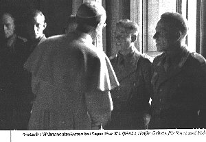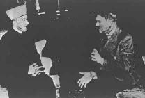 Hitler in gesprek met zijn geestverwant Hadj Amin al-Hoesseini. Dit keer geen katholiek, maar een moslim. De grootmoefti van Jeruzalem, Hadj Amin al-Hoesseini (interessant detail; al-Hoesseini was de oom van PLO leider Yasser Afafat), was in de jaren 20 en 30 verantwoordelijk voor gewelddadige acties tegen de joden in Palestina. In 1941 vluchtte de moefti naar Nazi-Duitsland waar hij op 28 november van datzelfde jaar een ontmoeting had met zijn geestverwant Adolf Hitler. Hij bezocht de concentratiekampen en vroeg aan Hitler om ook vernietigingskampen te bouwen in het middenoosten. Daarnaast rekruteerde de moefti tienduizenden islamitische strijders voor de SS.